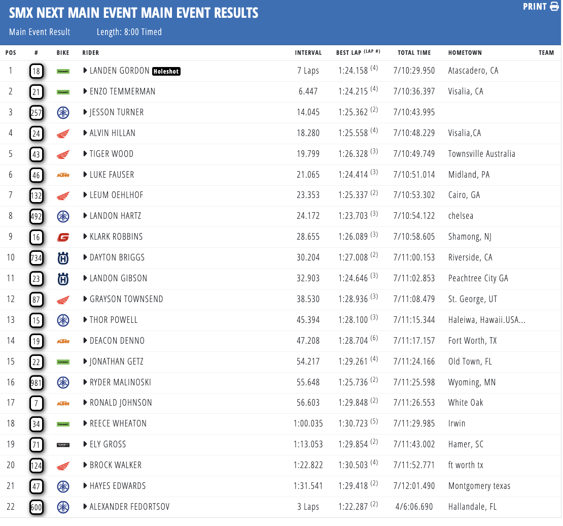 | 7 | Daxton Bennick | 5.880 | 1:21.497 | Morganton, NC | Yamaha | |