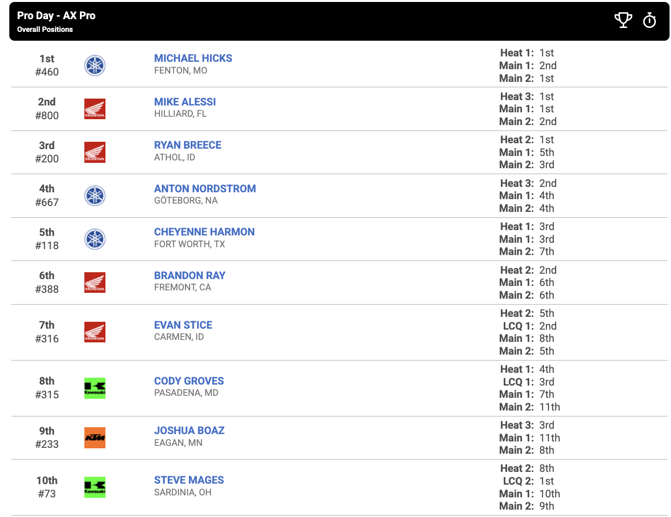| 4 | Chance Hymas | 3.646 | 1:20.621 | Pocatello, ID | Honda | |